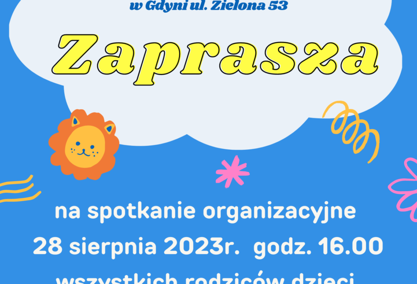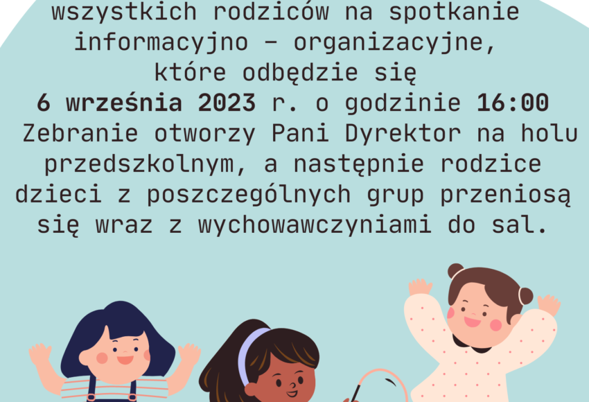 Szanowni Rodzice informujemy, że 6 września 2023r. o godz. 16:00 w budynku przedszkola odbędzie się dla Państwa zebranie informacyjno- organizacyjne. Ze względu na charakter spotkania, prosimy o przybycie Rodziców bez dzieci.
