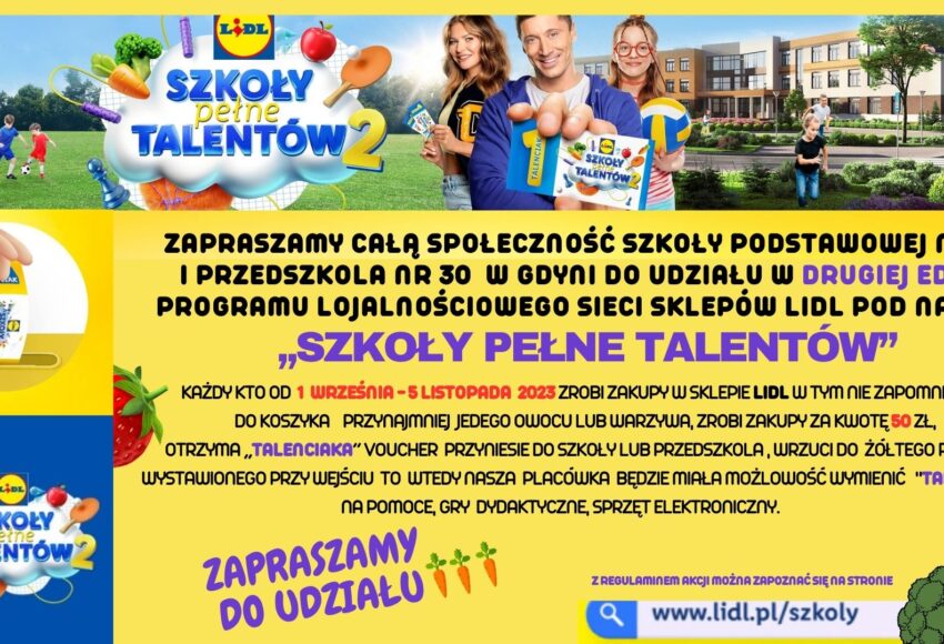 Szanowni Państwo w imieniu uczniów, pracowników Zespołu Szkolno – Przedszkolnego nr 6 w Gdyni zachęcam do wzięcia udziału w drugiej edycji programu, który proponuje sieć sklepów LIDL „Szkoły pełne talentów”. W terminie od 01 września 2023 roku do 05 listopada 2023 roku Klienci Organizatora otrzymają „Talenciak” z indywidualnym kodem QR […]